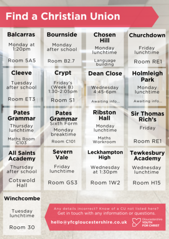 If you or a young person is looking for a Christian Union in Gloucestershire, we've put together a list.